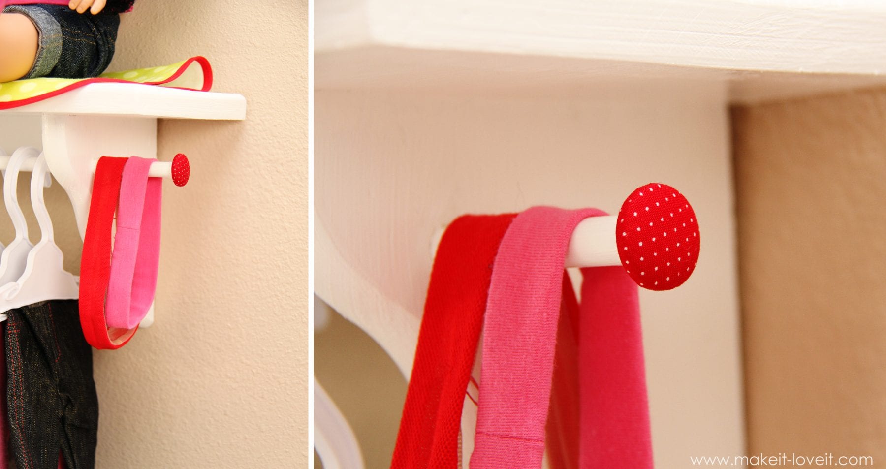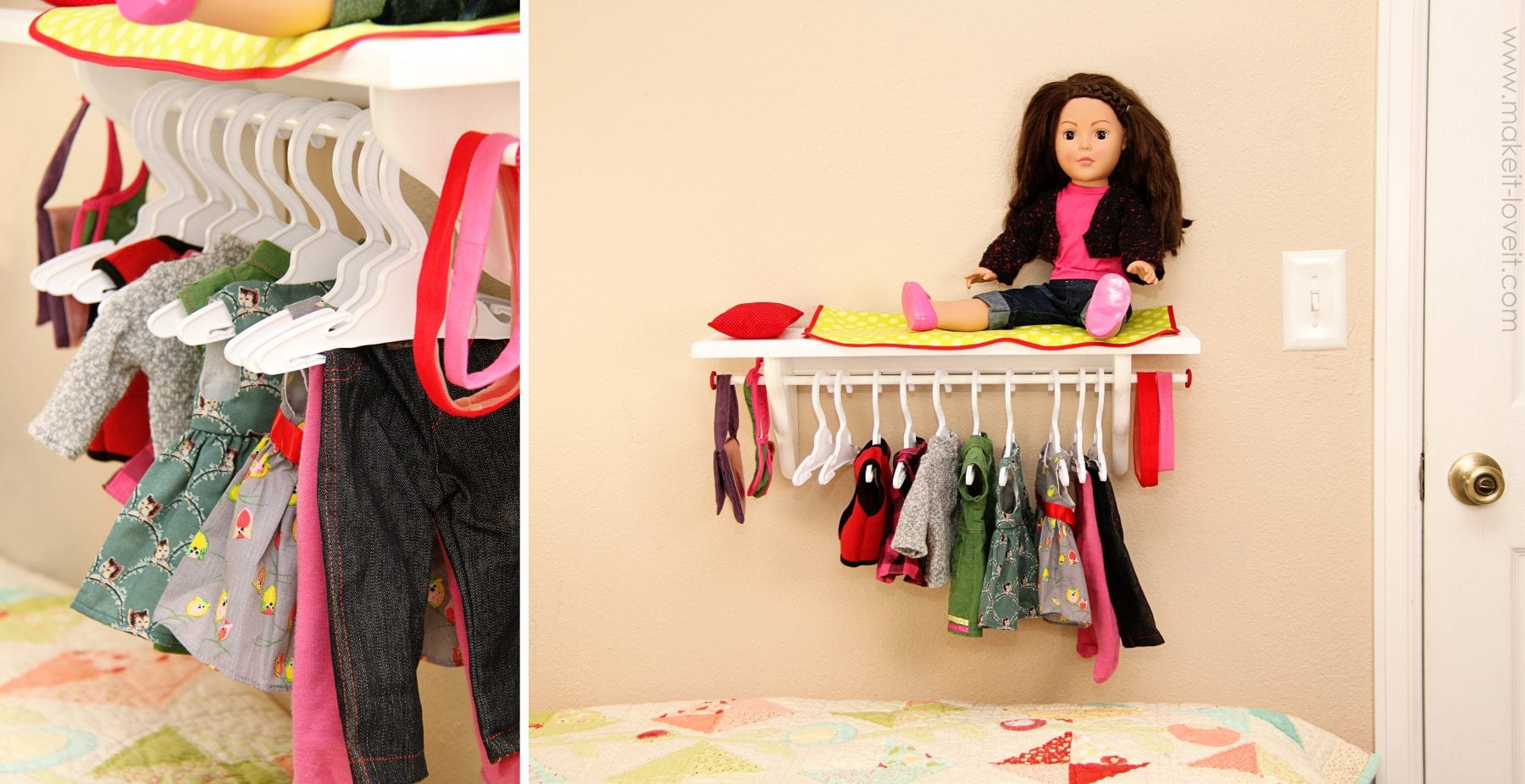 This could be any where. Above a bookshelf, by the toy bins, in a toy room, near the closet, anywhere. And if you have a doll that lives in your house that comes with even 2 or 3 extra outfits, you totally understand the crazy mess of doll clothes strewn everywhere. So make it fun and let your little girl keep her doll things all together and organized. And off the stinkin’ floor.