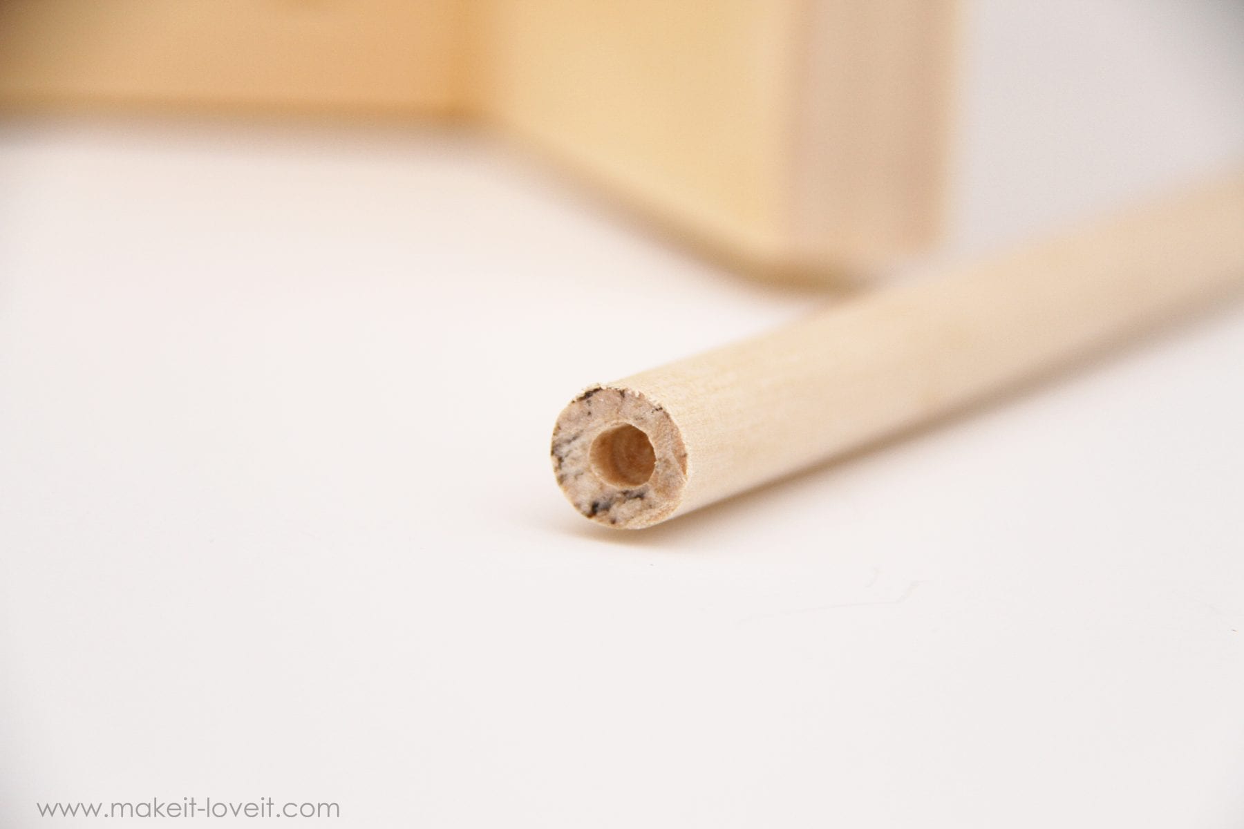 Then, with a smaller drill bit, Idrilled out little holes on both ends of the dowel for my button cover backs to fit into.