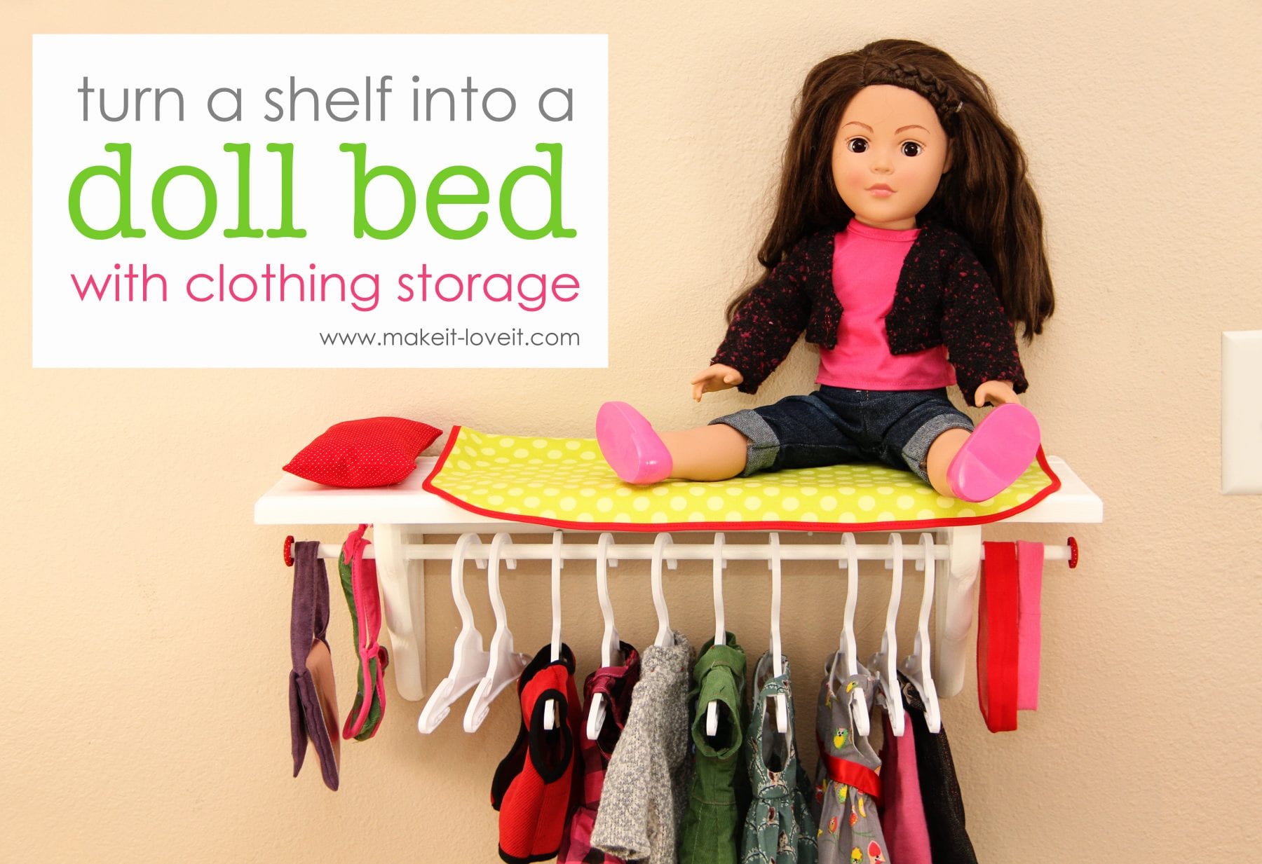 Turn a shelf into a Doll Bed with Clothing Storage (for 18 inch dolls)