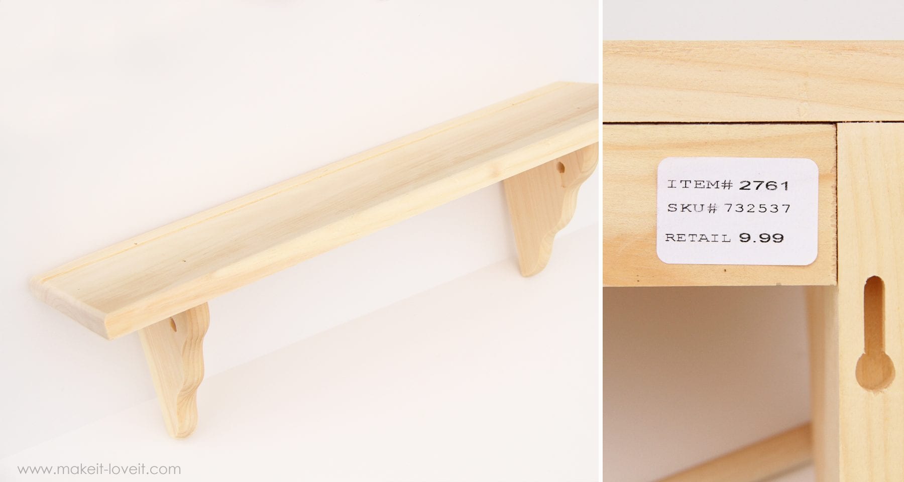 First of all, there are probably many shelves that would work for this project. I found this bare wooden shelf at Hobby Lobby. They always have things on sale for 50% off. If they don’t have what you want on sale, wait a week or two. So this shelf was originally $10 but I got it on sale for $5. It measures about 20 inches long and about 7 inches deep. Perfect for the standard 18 inch dolls (American Girl Dolls and the knock offs).